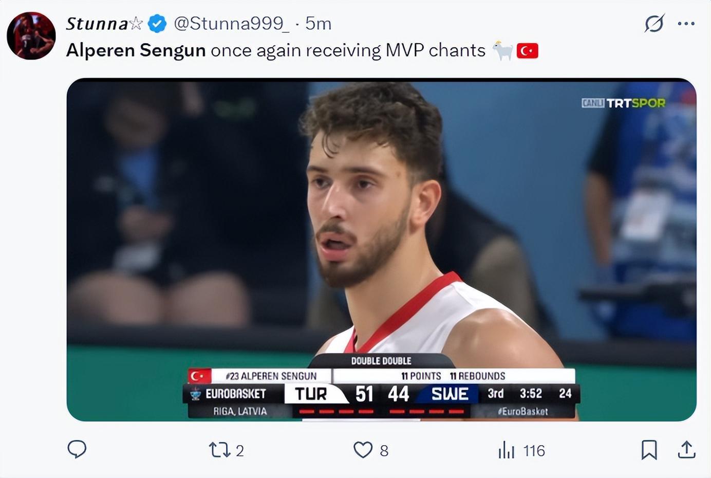 瑞典的策略就是封堵申京的个人进攻,包夹迫使申京提前传球,结果土耳其此役的外线的确不准,申京上半场10中3手感也不佳,只拿到7分8篮板1助攻。